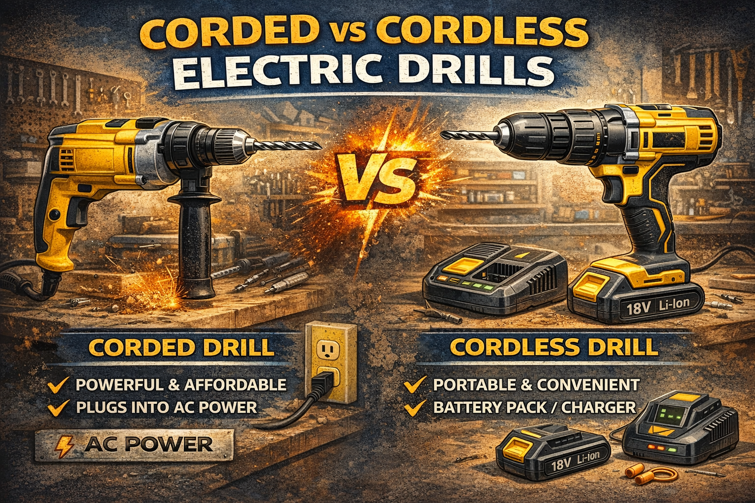 Corded Drills කියන්නේ වැඩ කරනකොට කේබල් එකකින් නිවසේ ප්රධාන විදුලි සැපයුමට සම්බන්ධ කරලා වැඩ කරන්න ඕන Drill වලටයි. එතකොට Cordless Drills කියන්නේ බැටරි වලින් වැඩ කරන, රැහැන් රහිත Drill වර්ගයක්.