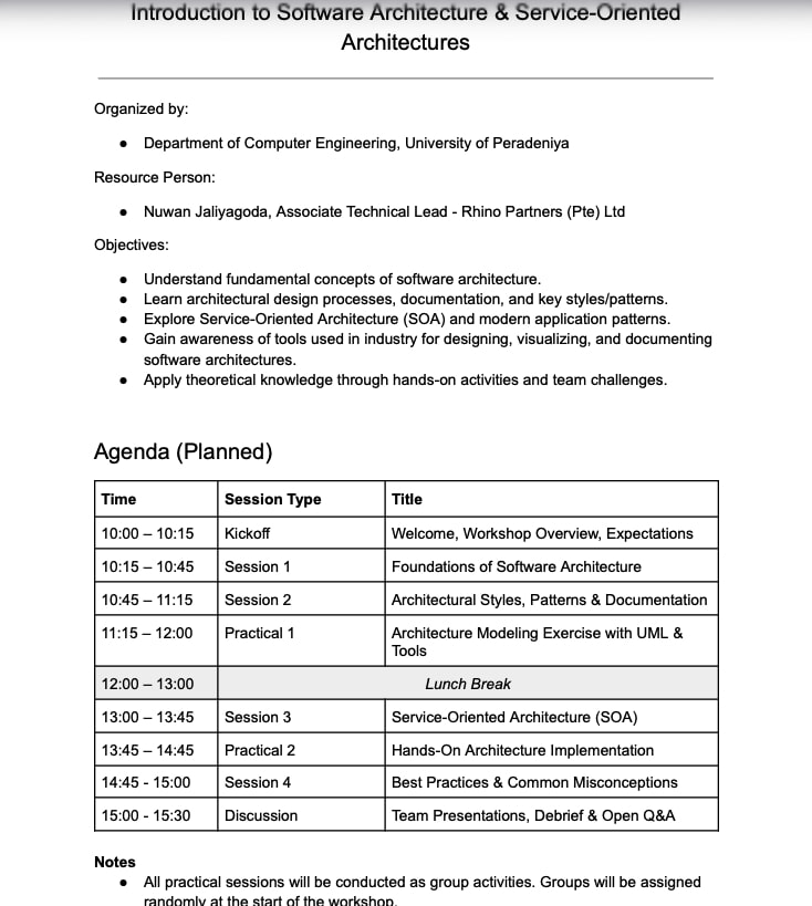 After the first session, I gave a short 5-minute break so everyone could stretch. During the break, I quickly uploaded the slides from Session 1 into the shared Google Drive folder so students could reference them later or follow along on their own devices if needed. Then we moved on to Session 2. By front-loading the theoretical content in the morning, we took advantage of the students’ fresh focus early in the day. Session 2 went well, with students particularly interested in the diagramming part. Many had not seen a real Architecture Decision Record before, so discussing an ADR example was eye-opening for them. I made sure to keep things interactive by asking questions and inviting a few students to share their thoughts or experiences (for instance, if they had seen any of these architectural patterns during internships or projects).
